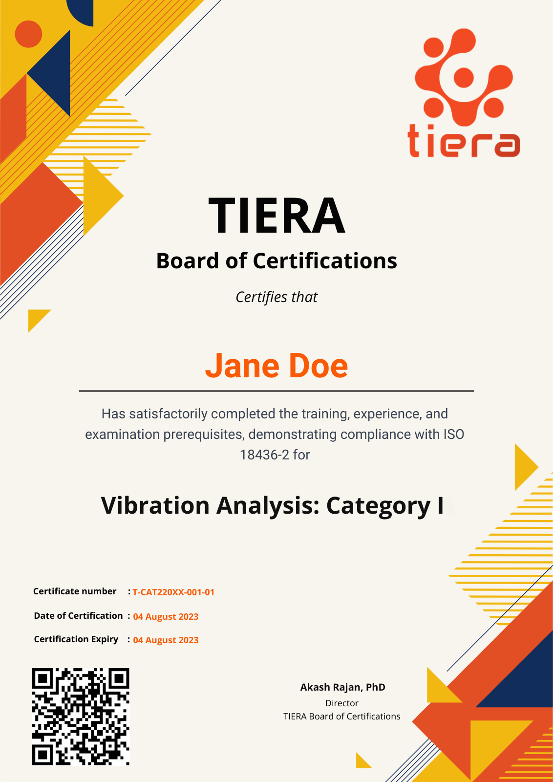 Meets ISO 18436-2 norms. Two hour exam with 75% cutoff. Verifiable Experience of Six months is mandatory for certification.